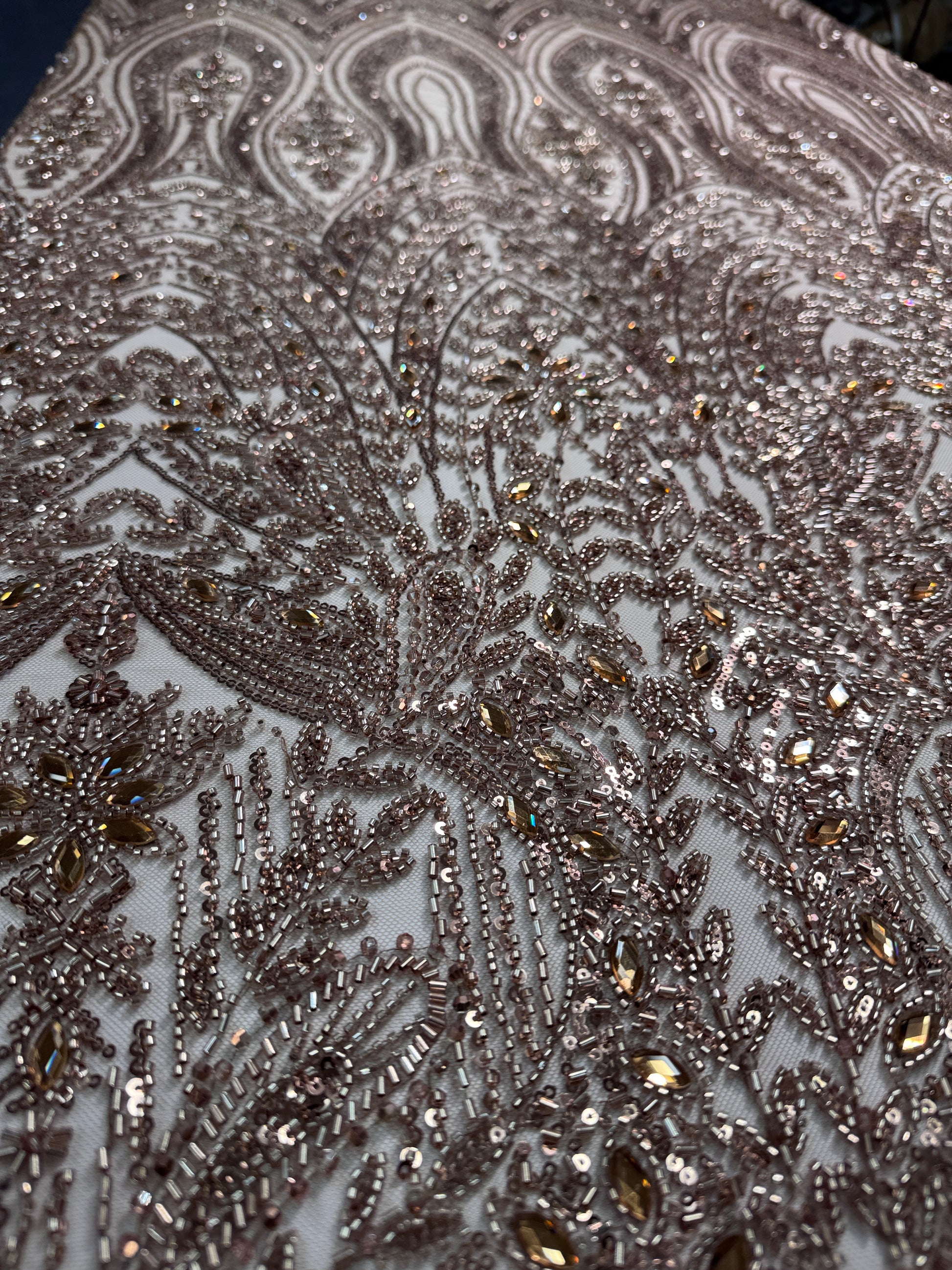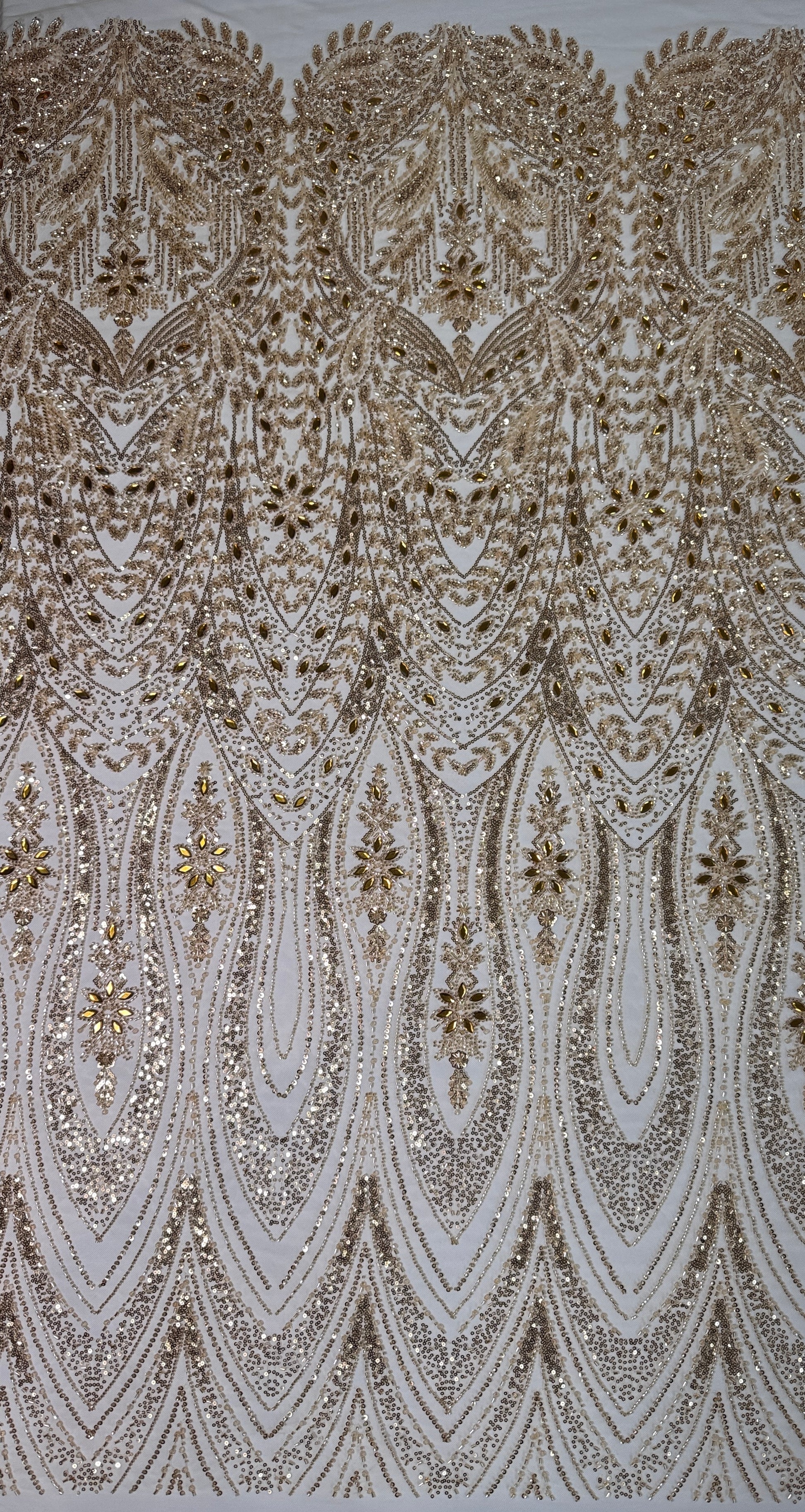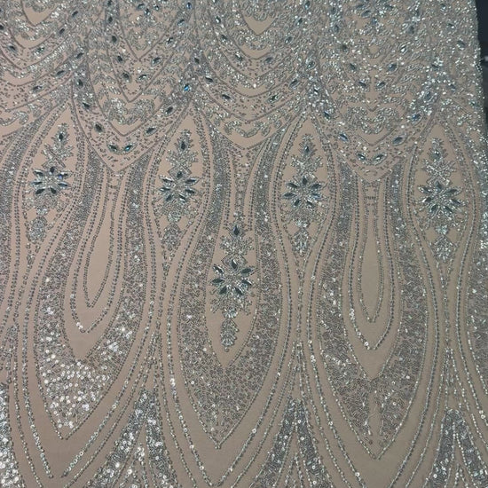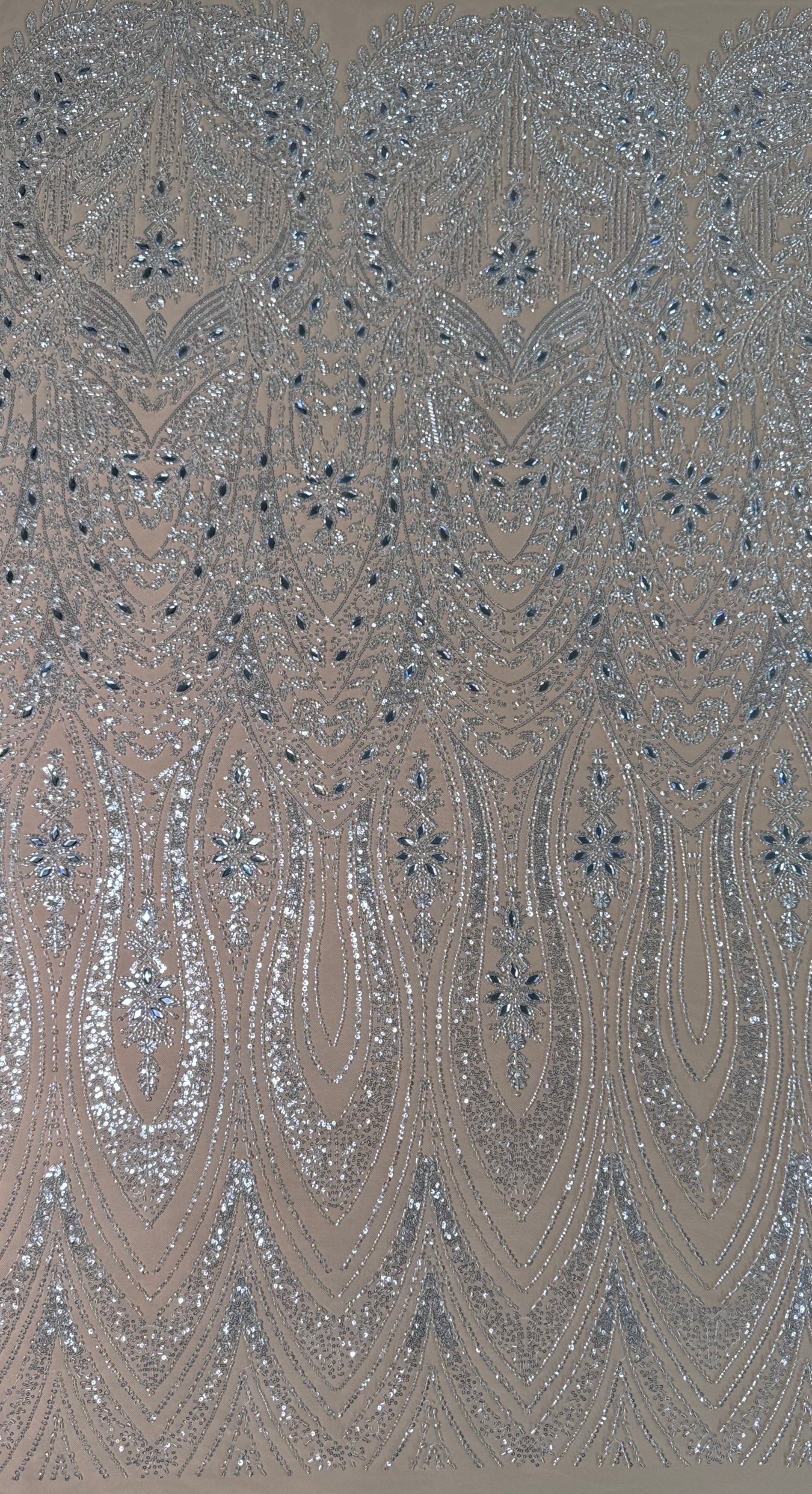 Luxurious cascade rhinestone and bead embellishment on a sturdy mesh backing , creating an eye-catching textile ideal for evening gowns, formal occasions, and prom wear. The intricate beadwork catches light beautifully, adding dimension and elegance to any design. Perfect for designers seeking statement-making embellished fabrics with reliable structure and lasting quality.