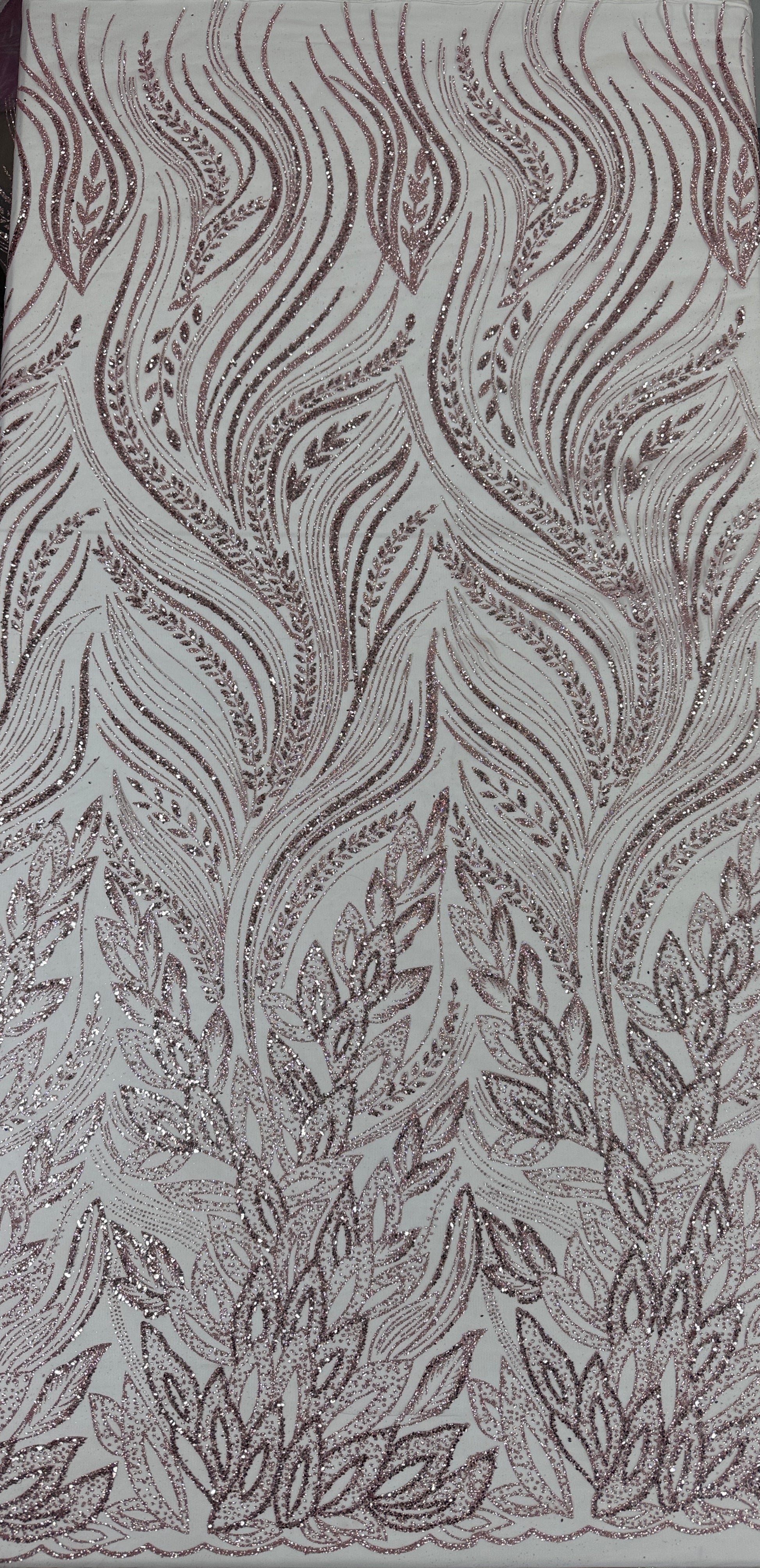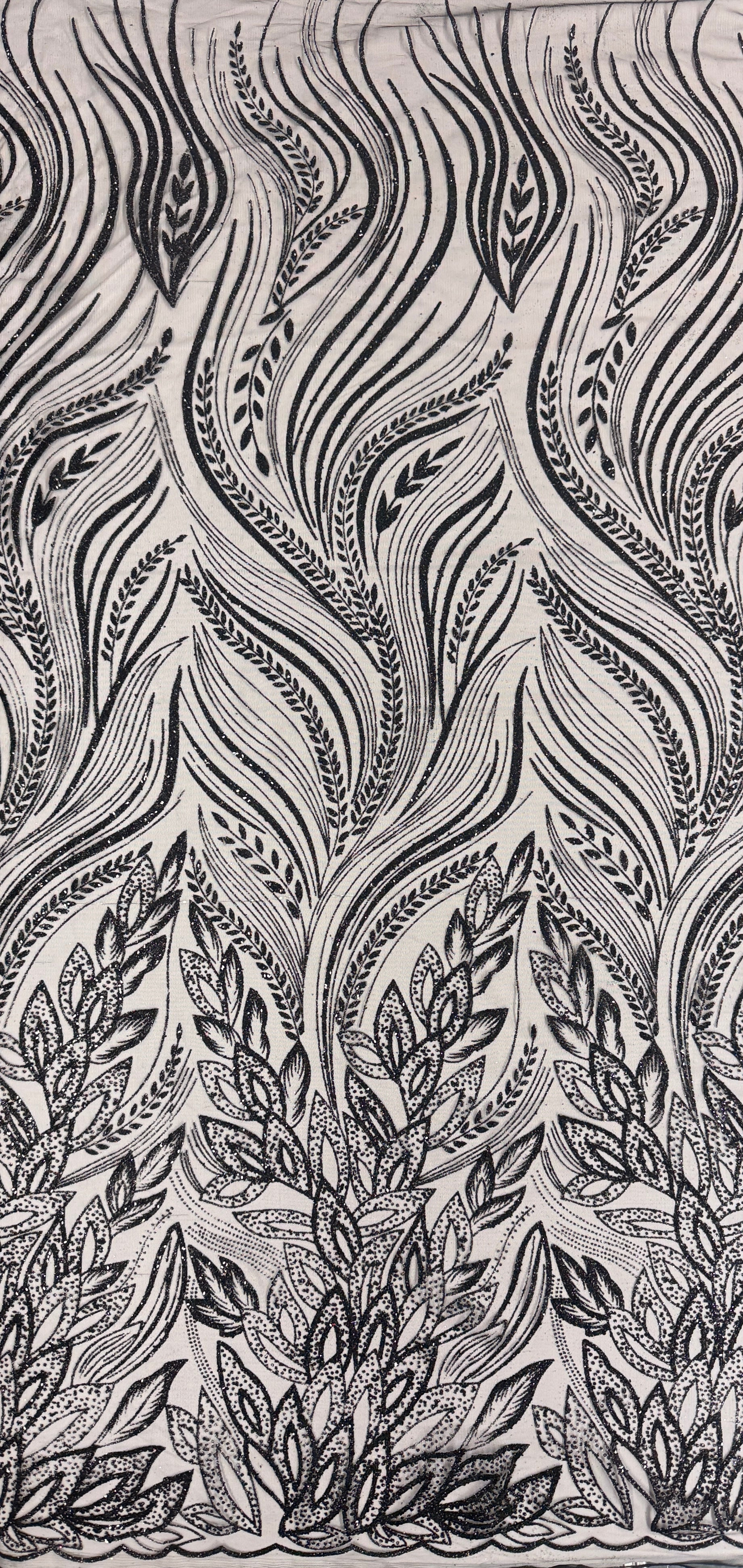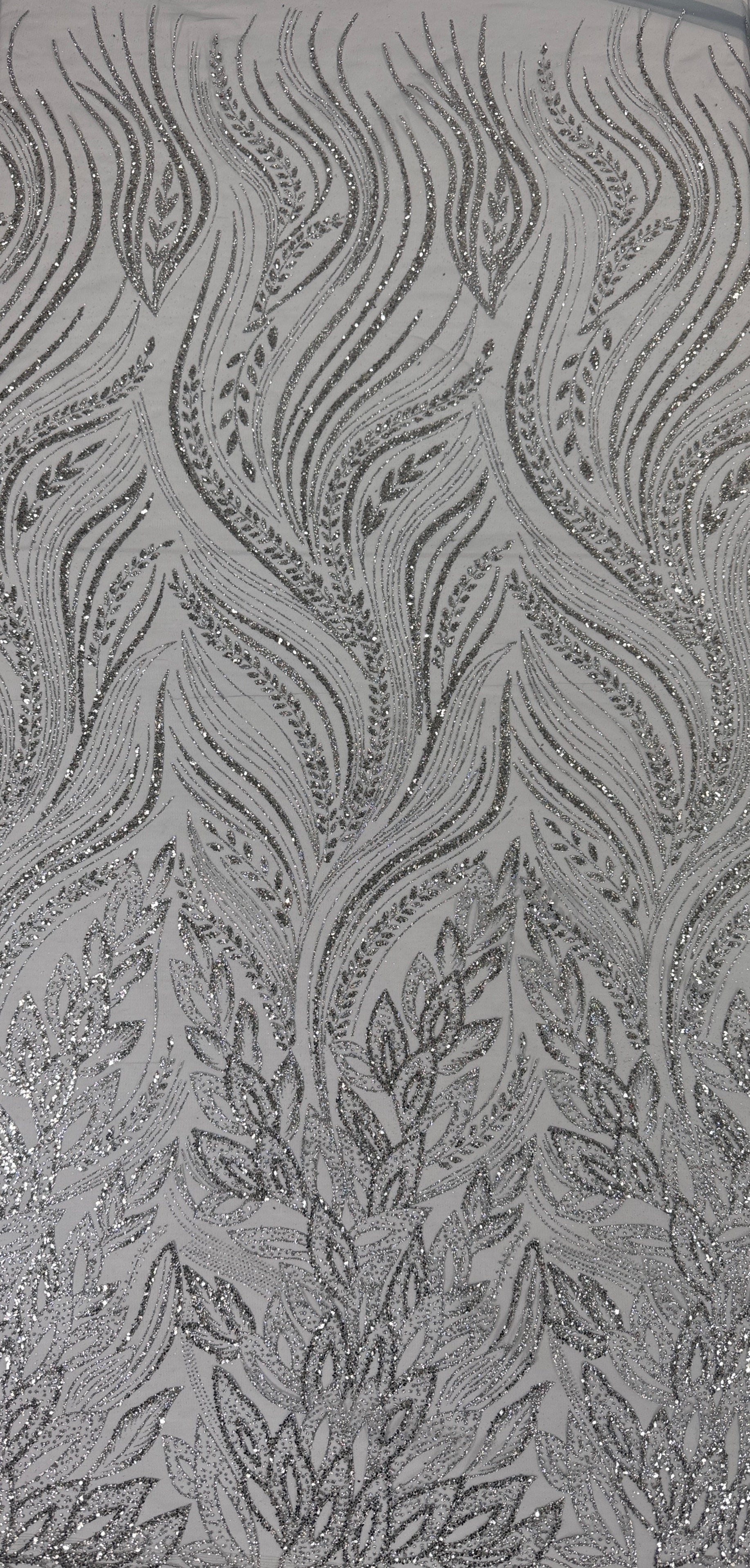 Botanical leaf motifs shimmer across this lightweight transparent mesh, creating an ethereal quality ideal for evening gowns, overlays, and special occasion garments. The delicate glitter pattern catches light beautifully while maintaining the fabric's fluid drape. Versatile enough for layering or as a standalone accent piece, this mesh elevates any luxury design with understated glamour and refined detail.