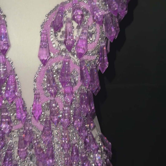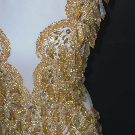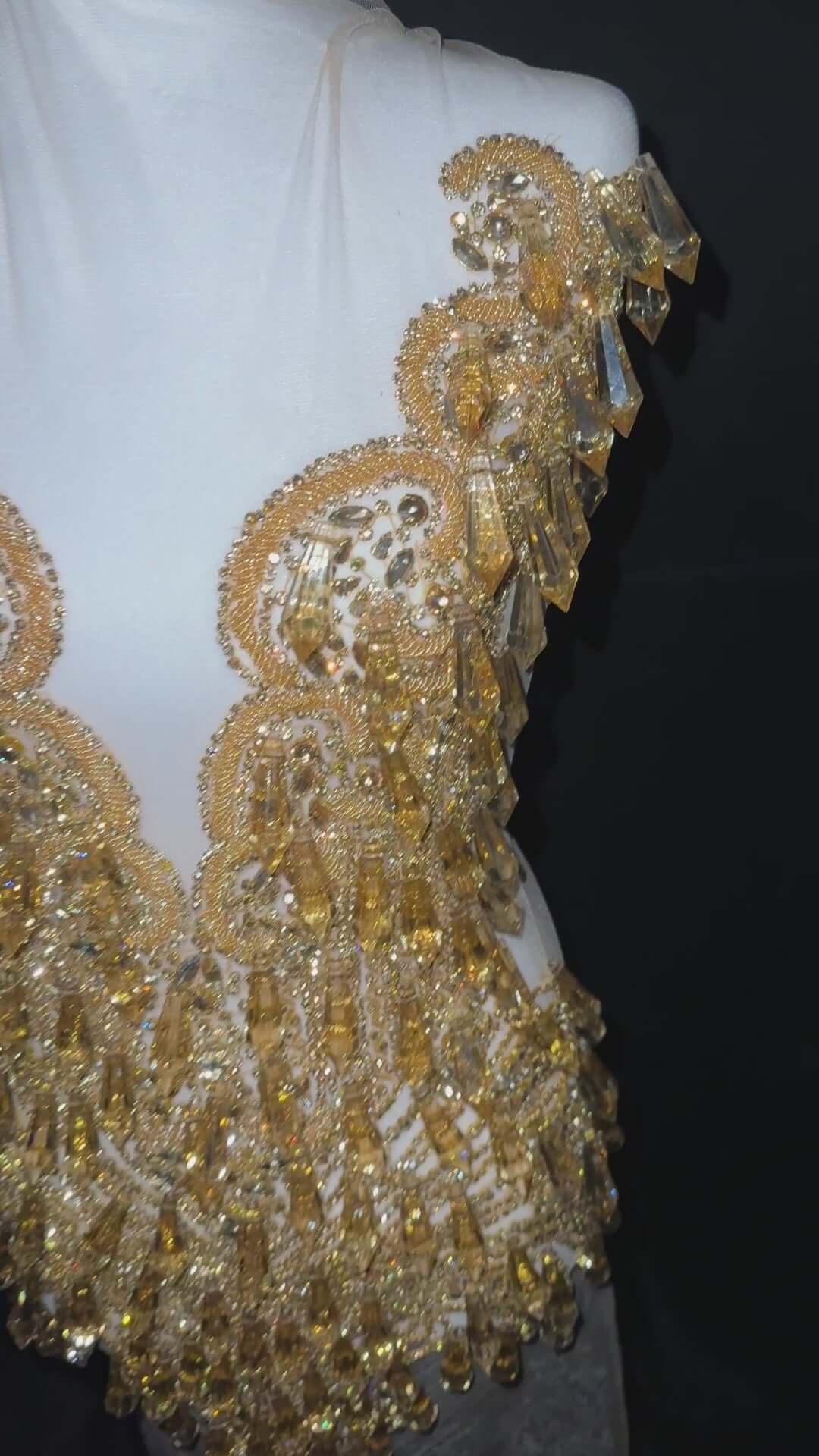 This stunning rhinestone bodice features intricate detailing and dazzling dangling crystals that catch the light with every movement, adding a touch of glamour and sophistication to any design. Crafted with an invisible mesh backing, it offers seamless and secure attachment, ensuring a flawless fit on a variety of garments. Perfect for creating show-stopping evening gowns, elegant prom dresses, and high-end fashion pieces, this bodice is a must-have for designers and fashion enthusiasts looking to elevate their creations. Whether for a red-carpet look or a bespoke couture piece, this design promises to transform any outfit into a masterpiece of elegance and luxury.