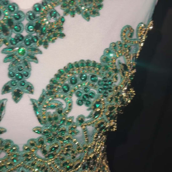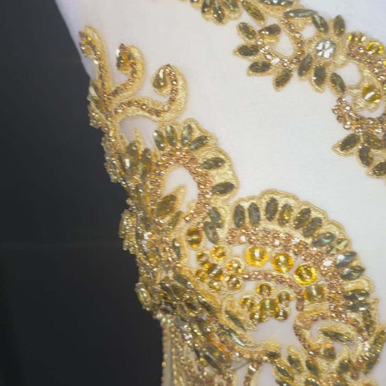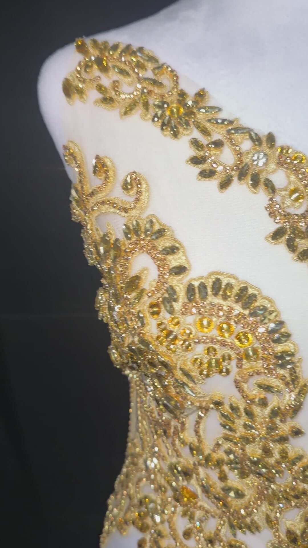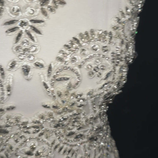 This is a luxurious and beautifully crafted applique designed to add a touch of elegance and sparkle to any garment. Featuring a delicate mesh backing, it ensures easy attachment and a seamless finish, making it perfect for designers who want to enhance their creations effortlessly. This exquisite bodice applique brings a sophisticated shimmer that elevates formalwear, bridal gowns, and special occasion outfits. Transform your designs with this stunning piece that combines convenience with high-end style, helping you create standout looks that captivate and impress.