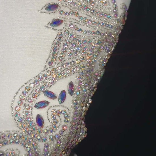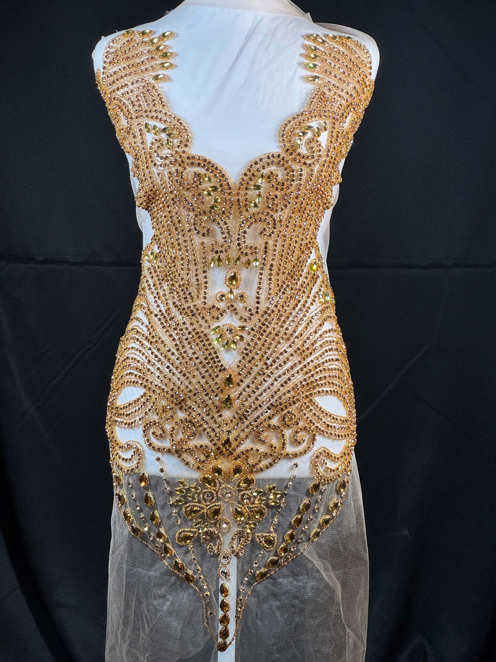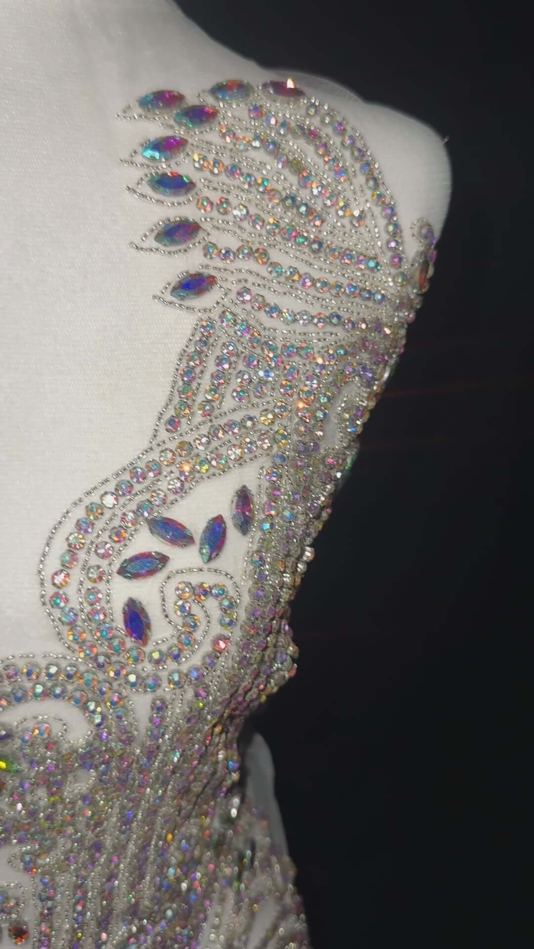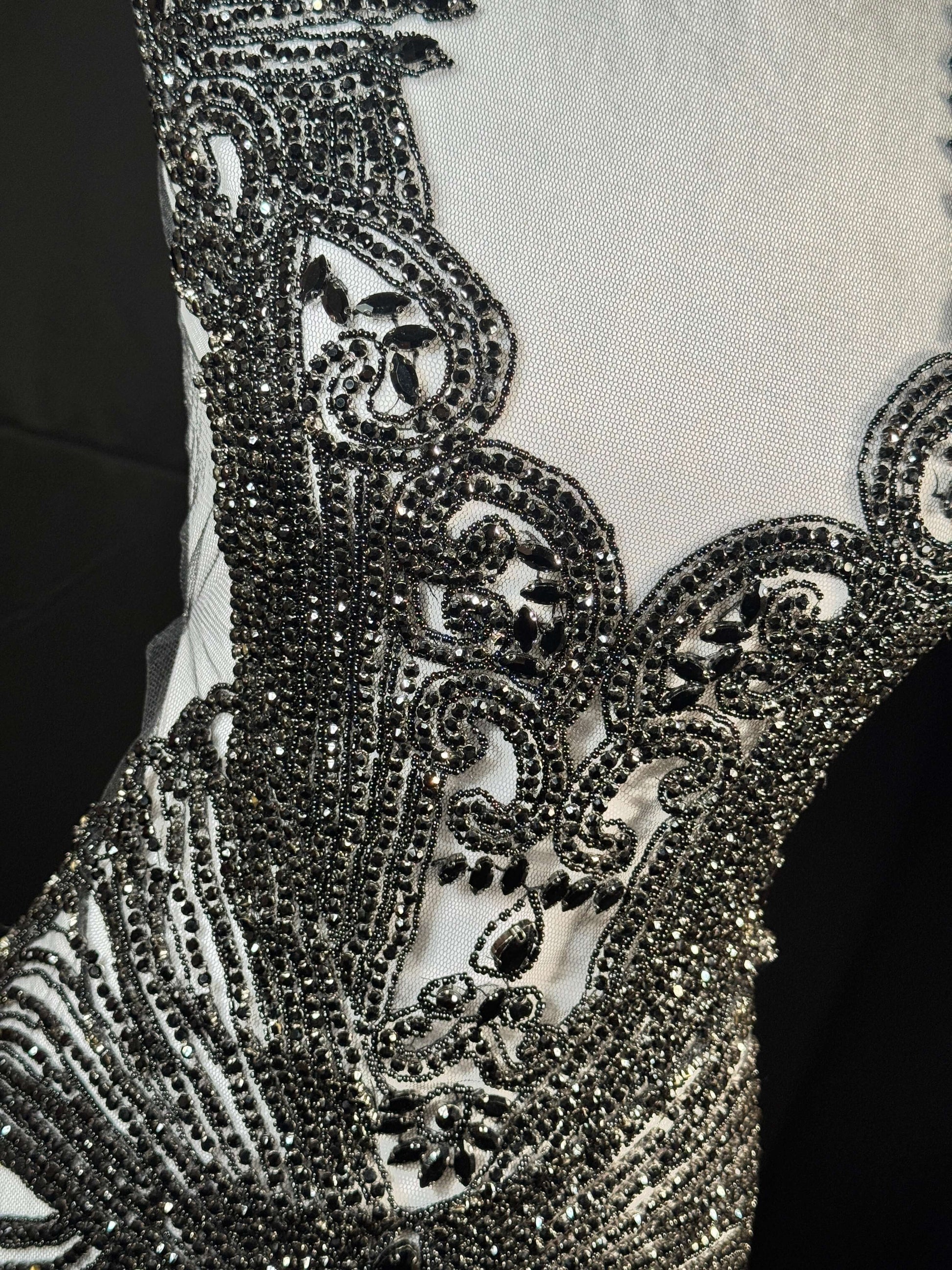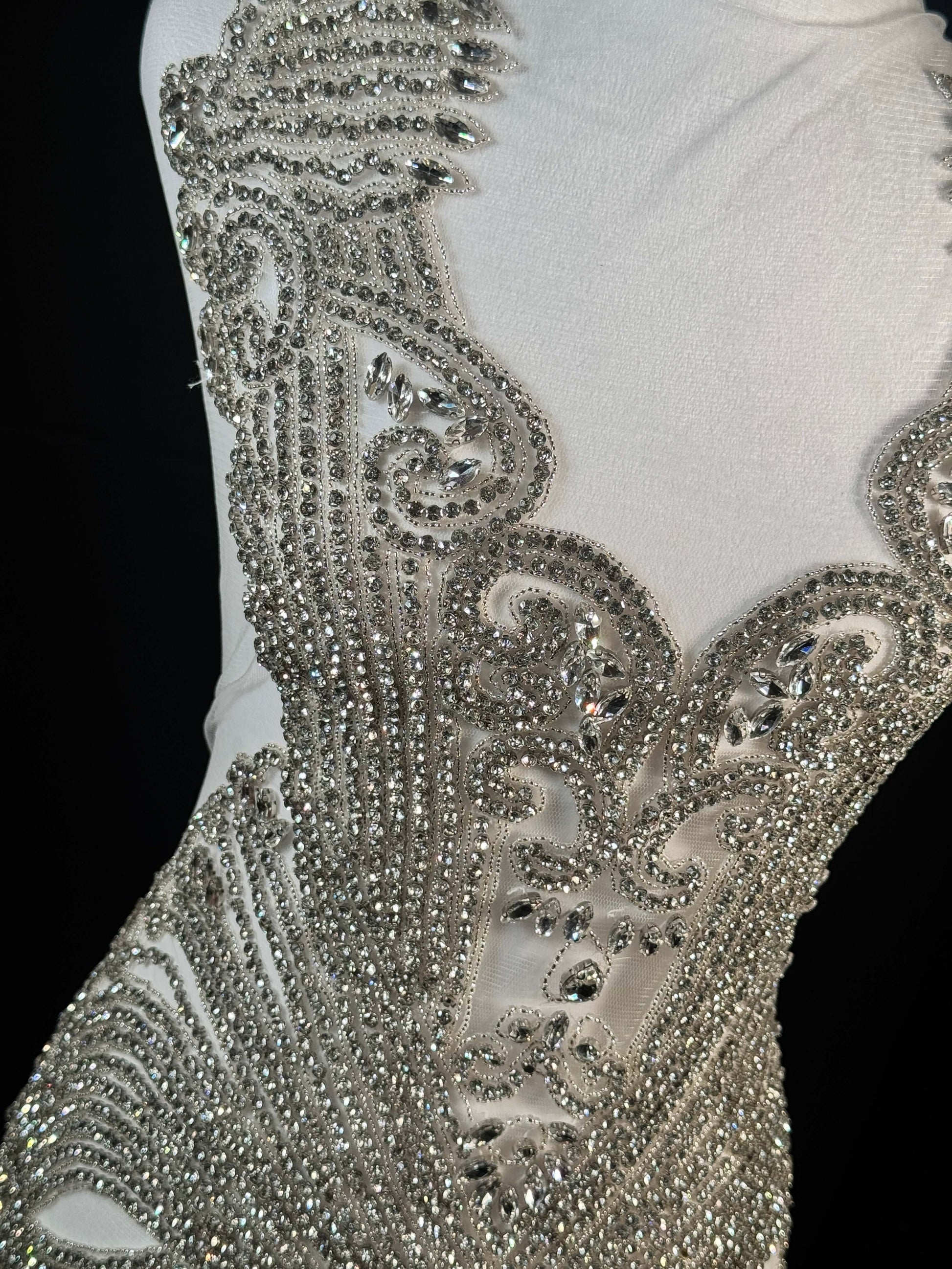This stunning rhinestone bodice features intricate detailing and dazzling dangling crystals that catch the light with every movement, adding a touch of glamour and sophistication to any design. Crafted with an invisible mesh backing, it offers seamless and secure attachment, ensuring a flawless fit on a variety of garments. Perfect for creating show-stopping evening gowns, elegant prom dresses, and high-end fashion pieces, this bodice is a must-have for designers and fashion enthusiasts looking to elevate their creations. Whether for a red-carpet look or a bespoke couture piece, this design promises to transform any outfit into a masterpiece of elegance and luxury.