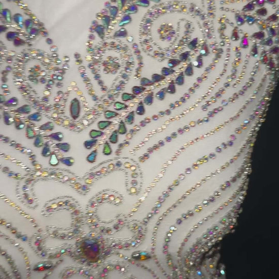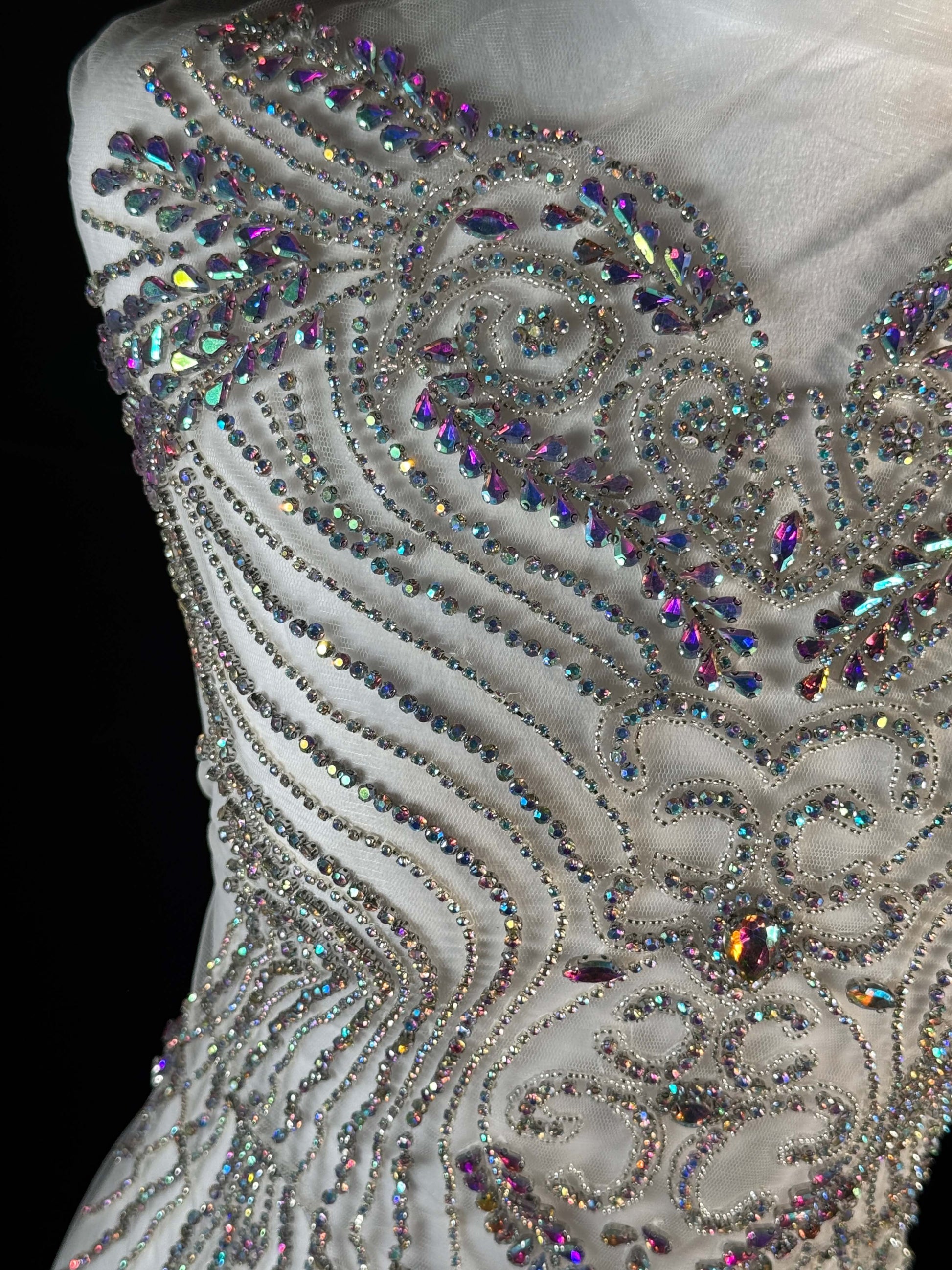 This Rhinestone bodice offers a simple yet sophisticated design that effortlessly adds a touch of class to any garment. Mounted on a delicate see-through mesh, it ensures easy application and a seamless integration with your fabric. This minimalist bodice is perfect for designers seeking understated elegance that enhances formalwear, bridal gowns, or special occasion dresses without overwhelming the overall look. Elevate your creations with this refined piece that combines subtle sparkle and timeless style, making every design uniquely graceful and memorable.