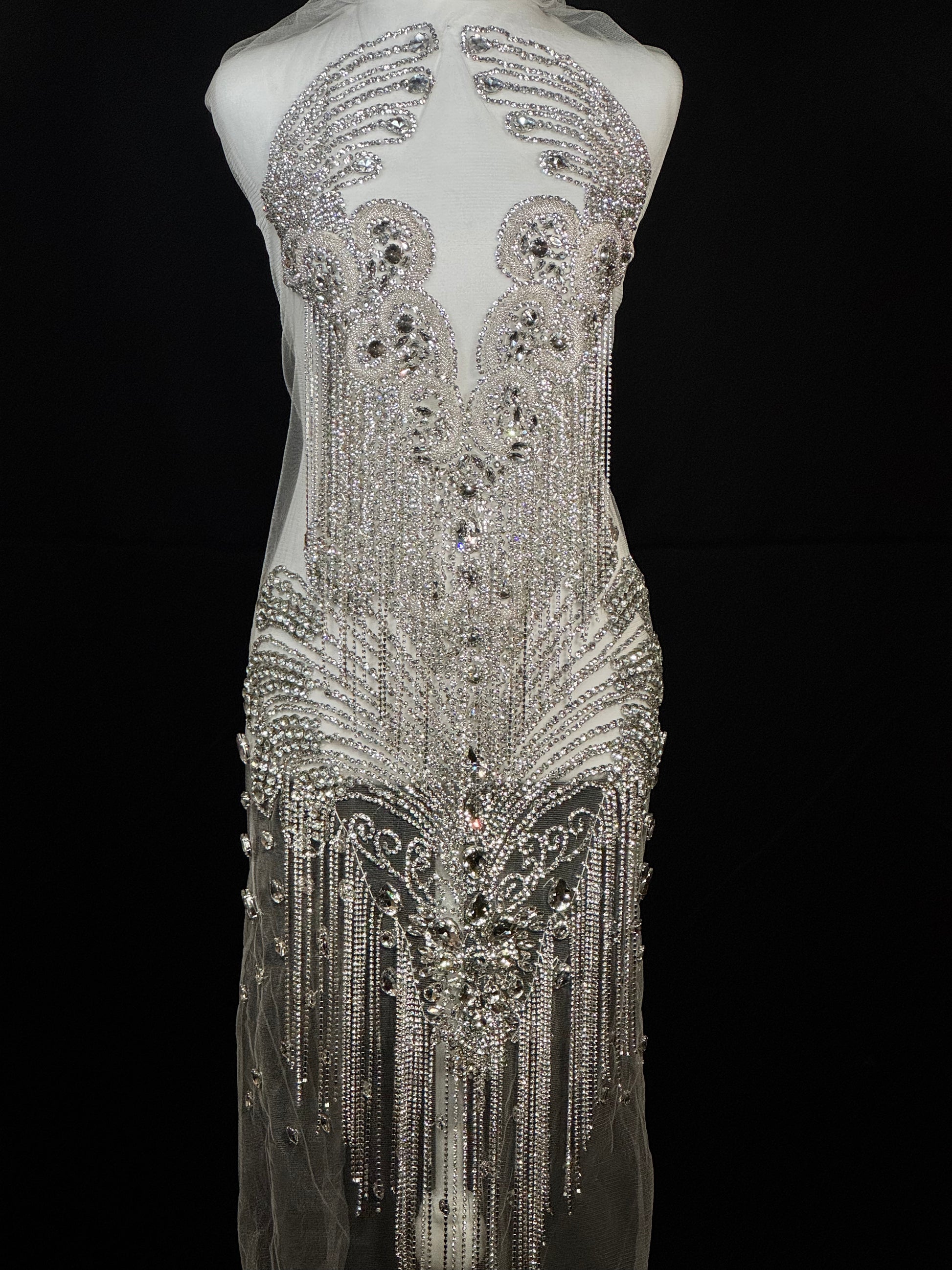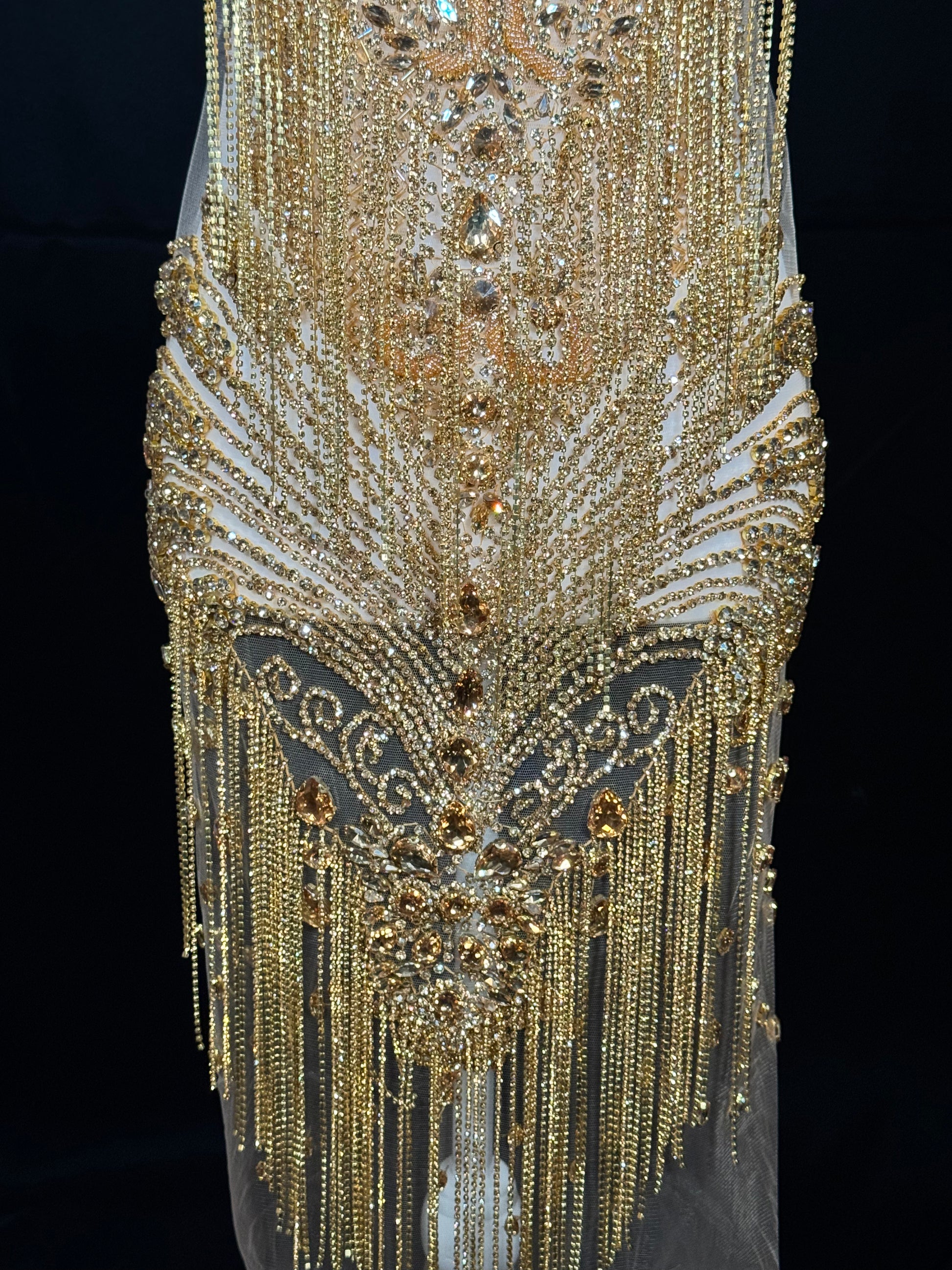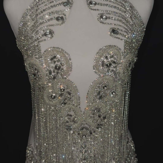 Create a show-stopping look with this dazzling rhinestone bodice, designed to add elegance and glamour to any gown or custom ensemble. Adorned with shimmering rhinestones and cascading fringe, this piece catches the light beautifully with every movement. The sheer nude illusion base provides a seamless, sculpted appearance, while the intricate detailing enhances its sophisticated allure. Perfect for couture designs, bridal wear, evening gowns, or statement-making outfits, this bodice is the ultimate foundation for a breathtaking creation.