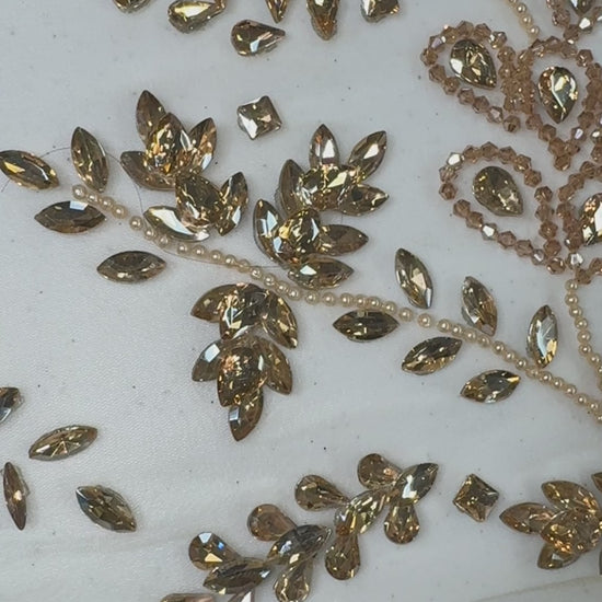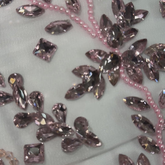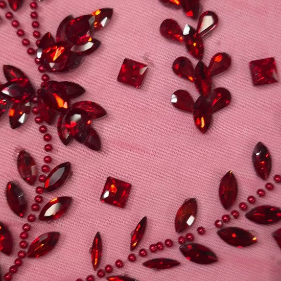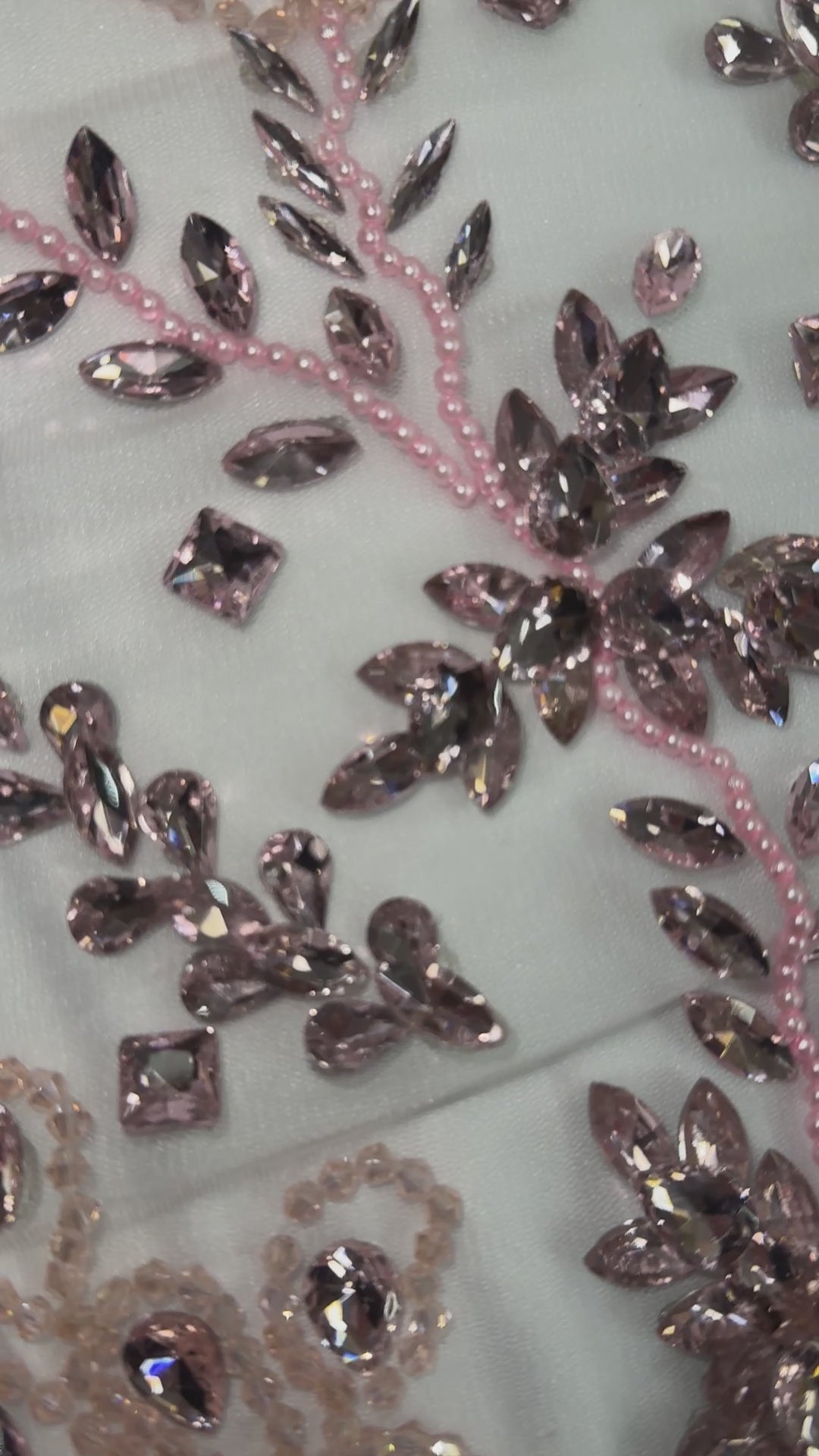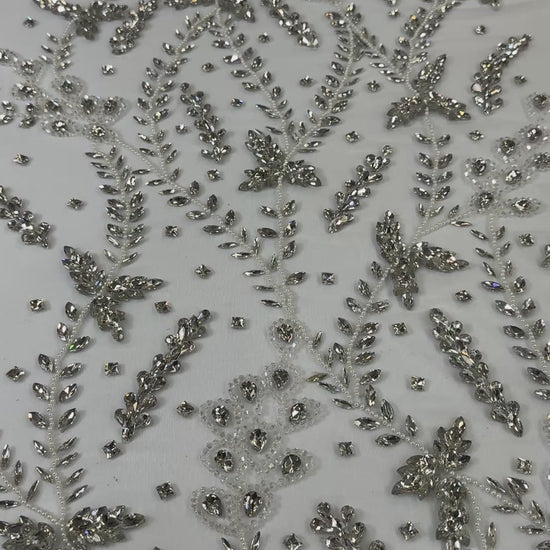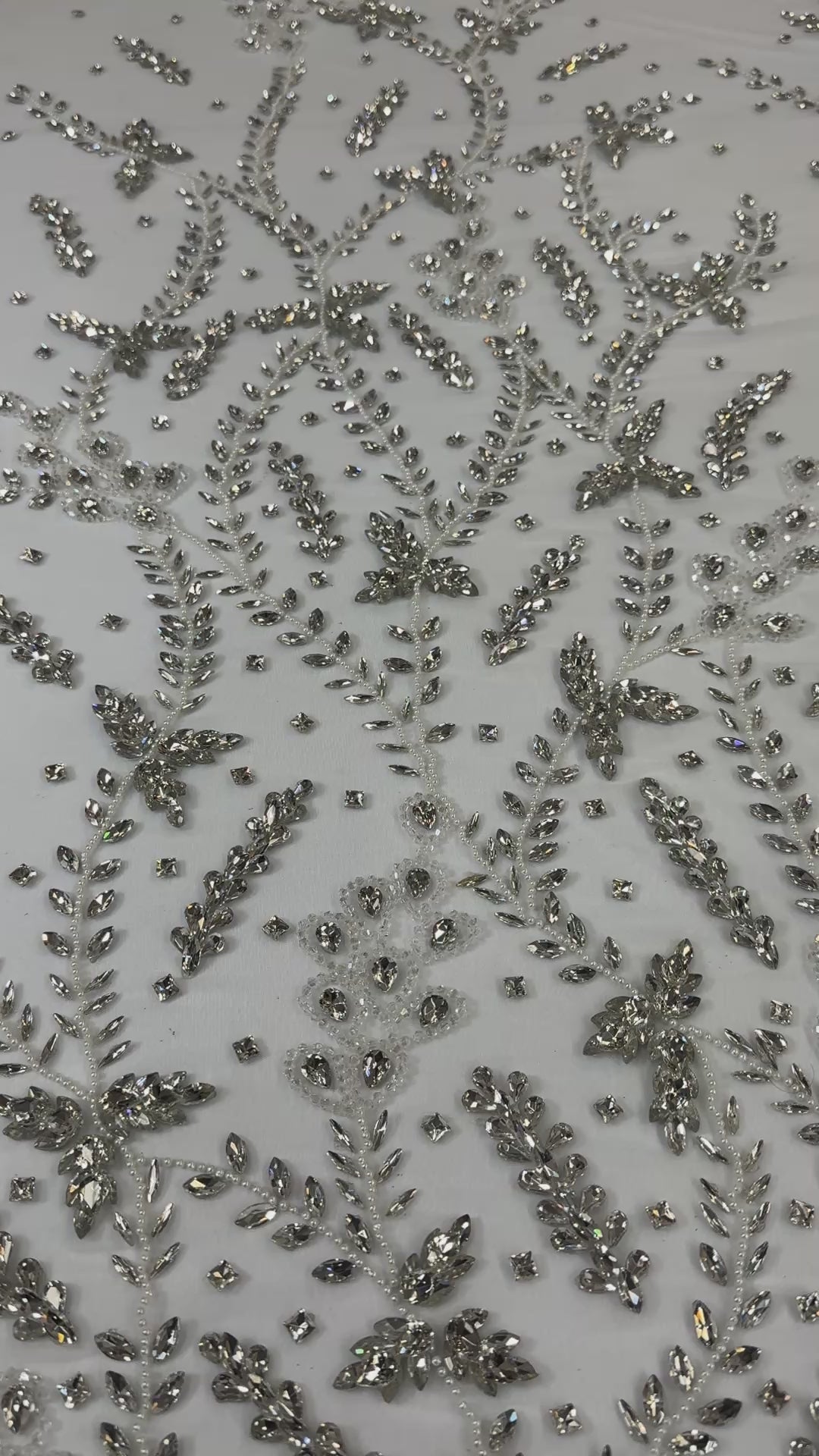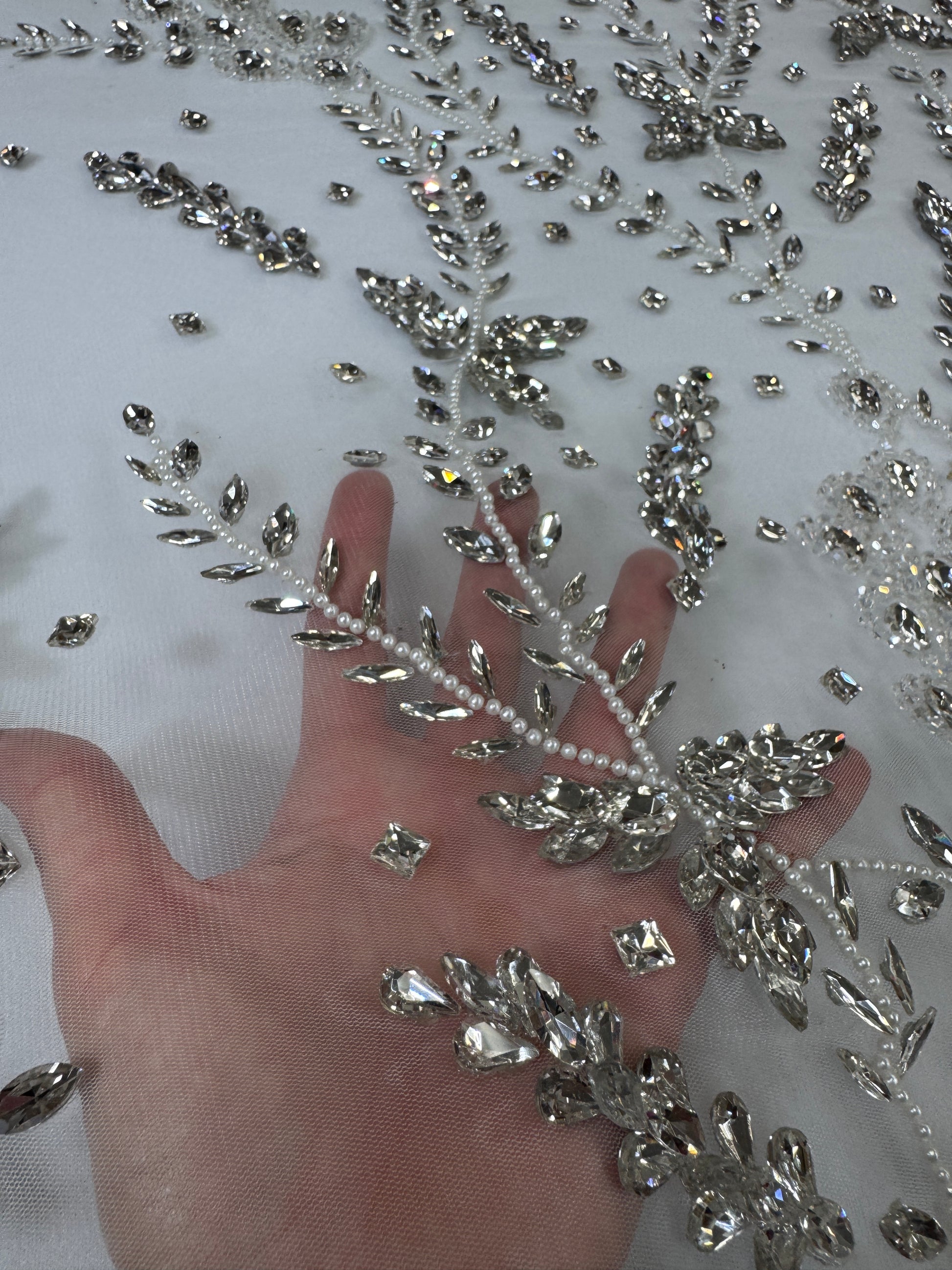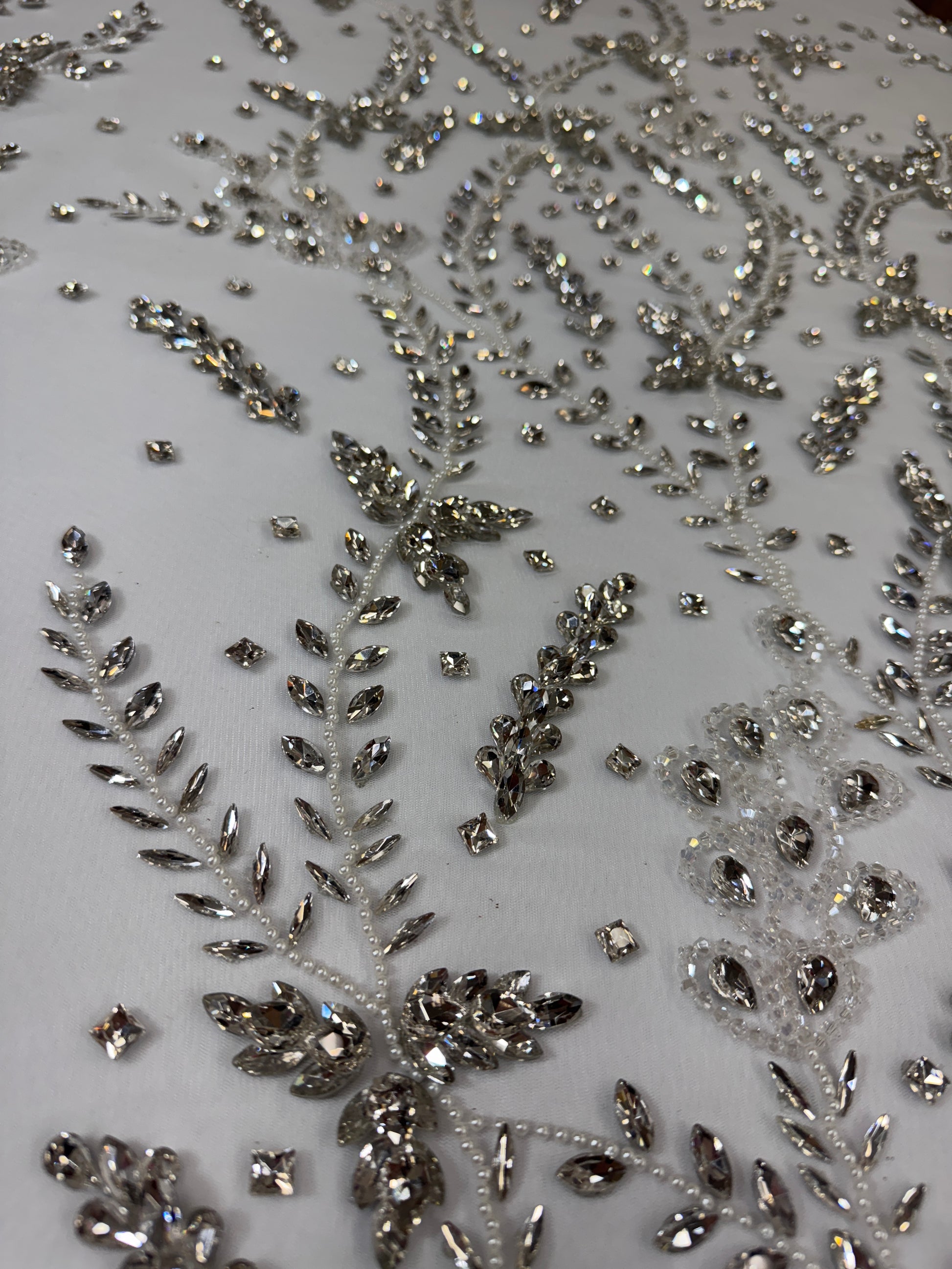 Exquisite handmade rhinestone mesh adorned with intricate leaf motifs that epitomize sophistication and refinement. Every inch sparkles with premium rhinestones meticulously applied to create a fabric of unparalleled opulence. Perfect for designers seeking that showstopping statement piece that commands attention and elevates any creation to couture status.