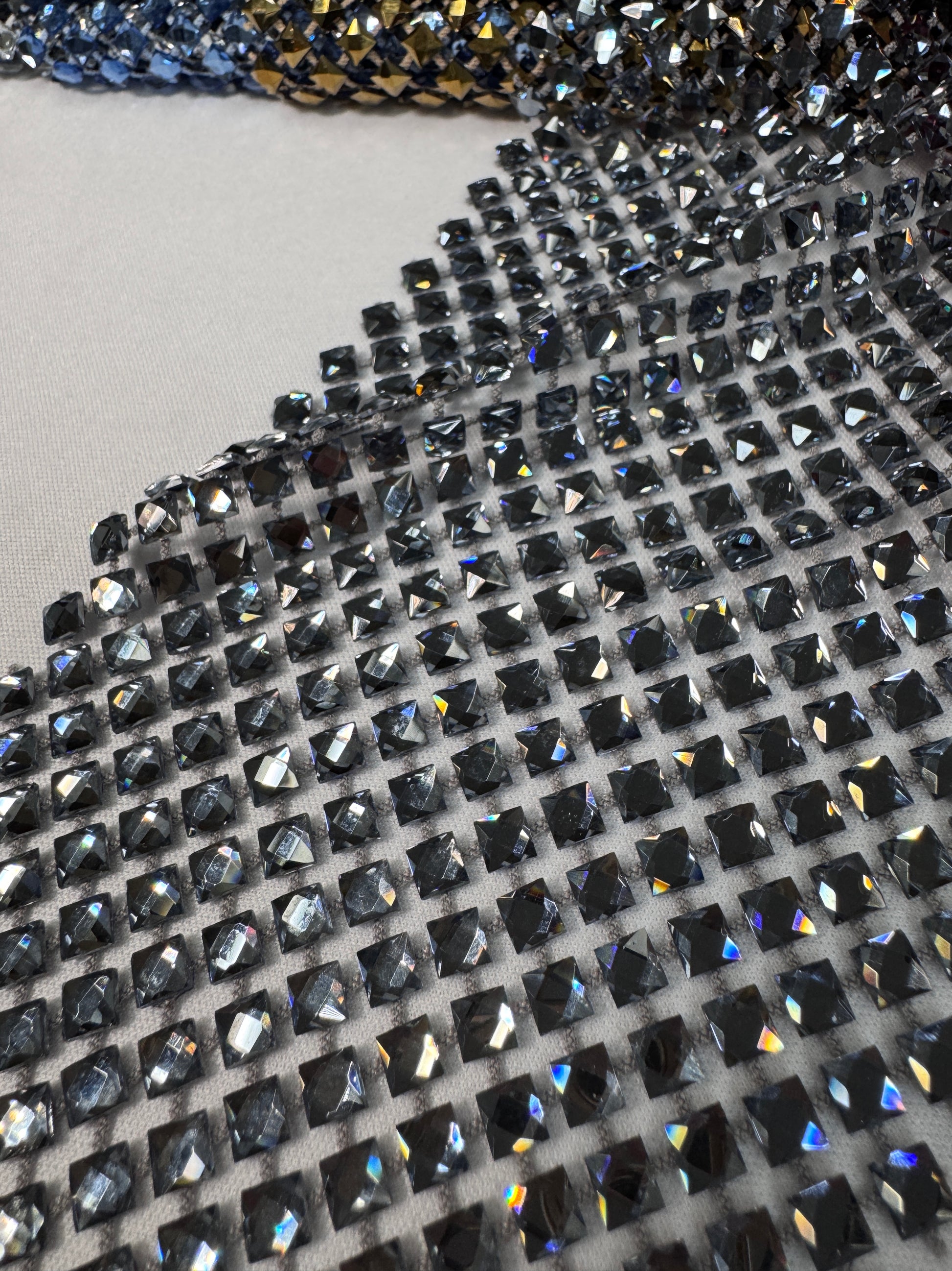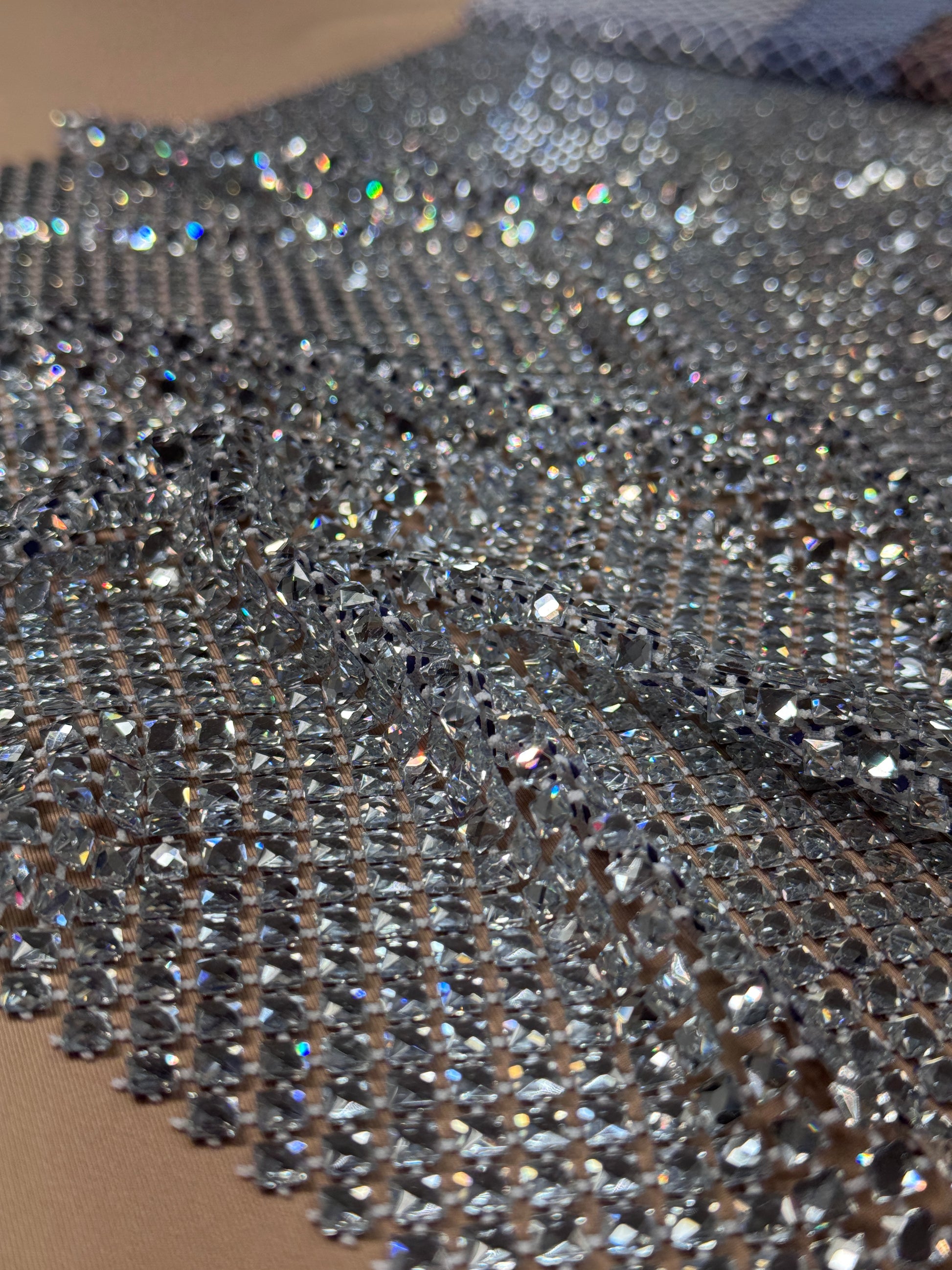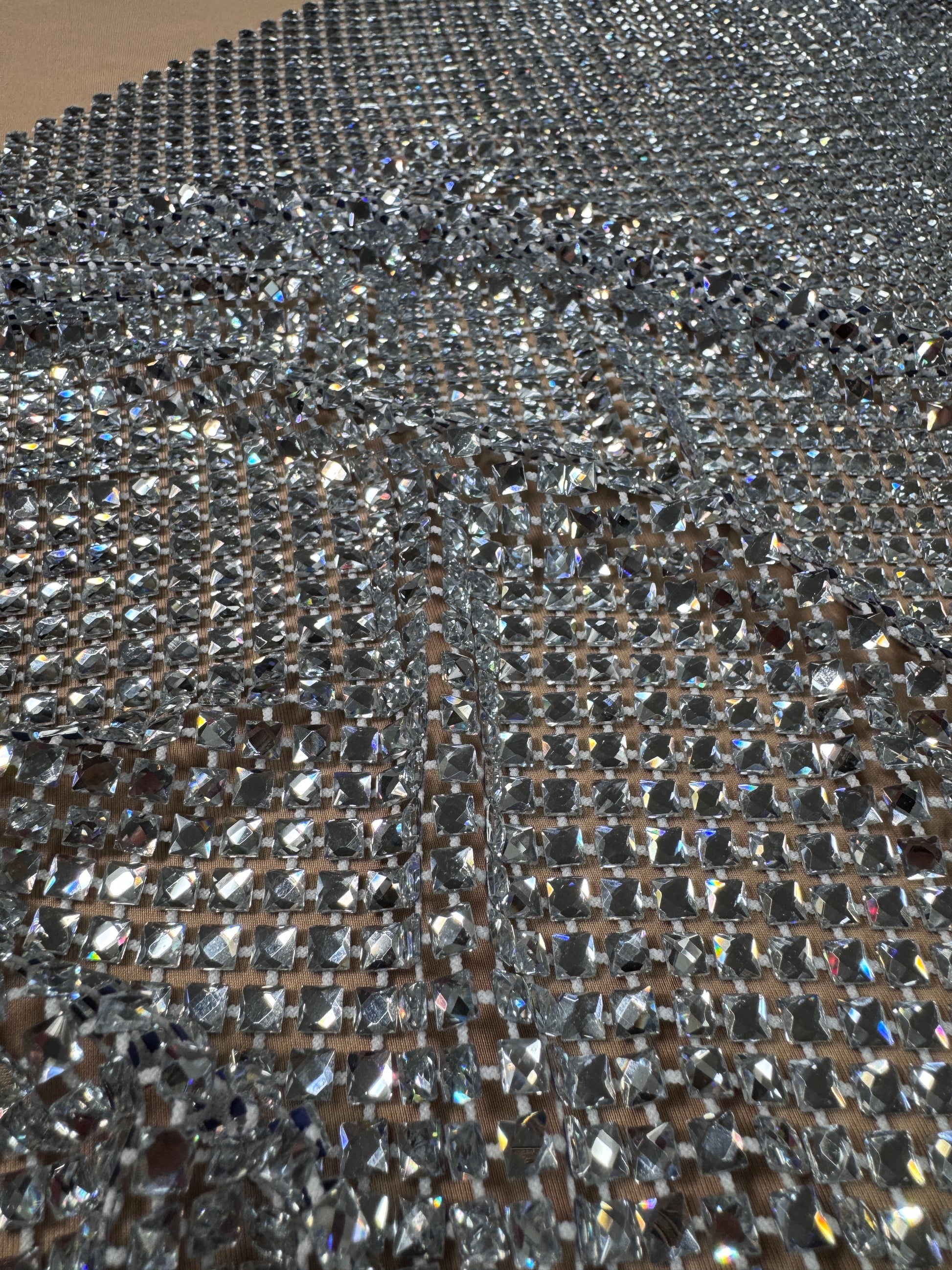 Transform your creations with this radiant rhinestone mesh, engineered for designers who demand impact. Precision-cut square stones deliver captivating sparkle across a supple stretch foundation that moves with your fabric, ideal for flowing silhouettes and sculptural draping. At 0.5cm x 0.5cm per stone, this textile combines luxury detail with versatile construction for collections that command attention.