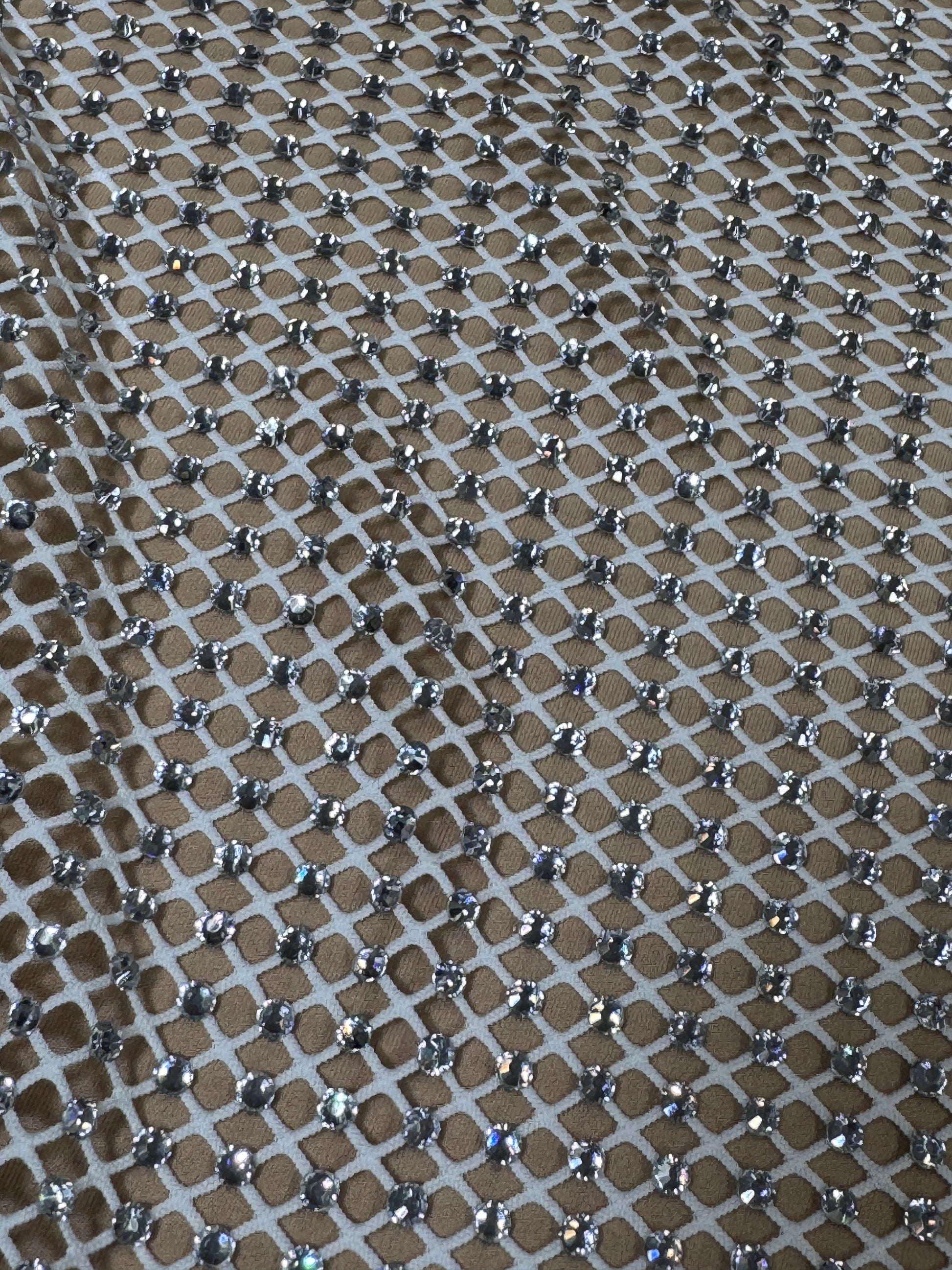 Elevate your designs with this luxurious stretch rhinestone mesh, featuring precision-set SS16 rhinestones on a flexible fishnet base. The shimmering crystal embellishments catch light beautifully while the elastic backing ensures comfortable wear and effortless draping. Perfect for evening wear, performance costumes, and high-impact fashion pieces that demand sparkle and movement.